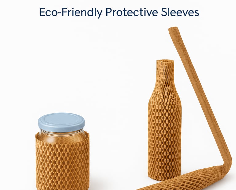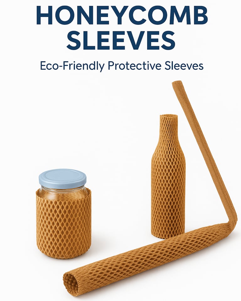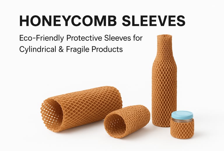 Honeycomb Sleeves are expandable kraft paper sleeves designed to protect bottles, jars, glass items, cosmetics, ceramics, and other cylindrical products during shipping. The hexagonal honeycomb structure provides 360-degree cushioning, making these sleeves a sustainable alternative to bubble wrap, foam nets, and plastic mesh sleeves. Lightweight, flexible, and shock-absorbent, they are ideal for e-commerce packaging, retail dispatches, and export shipments.